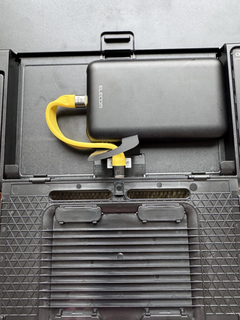 ケーブルが中に入ったら、ケーブルをまとめてからモバイルバッテリーに接続します。