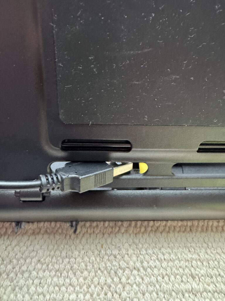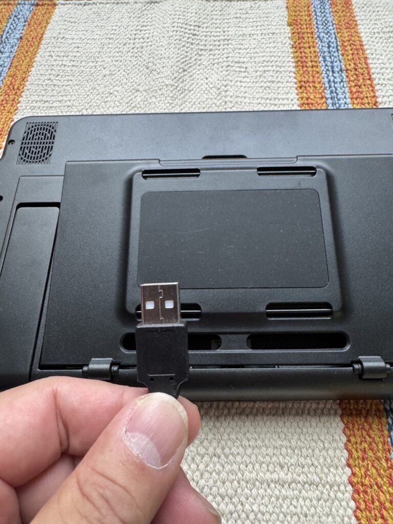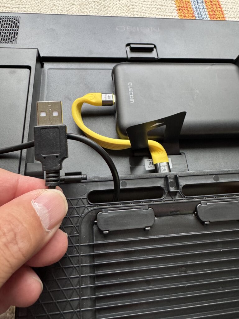 本体背面左下の穴より、USBタイプの電源ケーブルをType-A(オス)の方からぐいぐいっと押し入れます。*破損注意