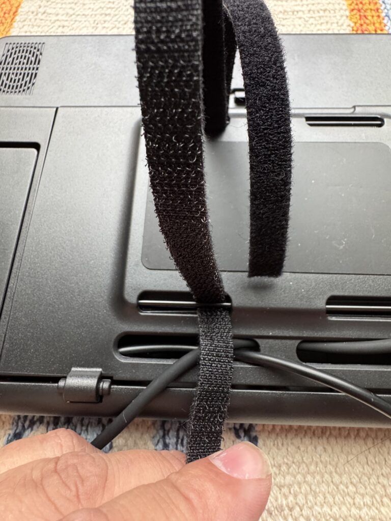 本体背面ベルトループに、配線ベルト面ファスナー*幅1cm長さ1.5m(DAISOで売っています。)をカットして2本取り付けます。